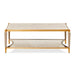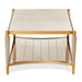 AICO Furniture St.Charles Rectangular Cocktail Table in Dove Gray 9088201-803. The Saint Charles Cocktail Table is a centerpiece that commands attention, distinguished by its intricate etching on the tinted glass shelf beneath. This feature not only adds visual interest but also a layer of sophistication to the piece. The Dove Gray finish on the wooden top is complemented by the bronze frame, making this table a blend of traditional craftsmanship and modern design.