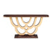 AICO Furniture Camellia Field Console Table in Warm Pecan 9090223-400. The Camellia Field Console Table exudes bold artistry and refined craftsmanship. Its mahogany veneer top, finished in warm pecan, is complemented by a sculptural base in antique gold, reminiscent of cascading petals. Perfect for an entryway or living space, this table blends practical function with eye-catching design.