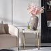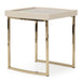 AICO Furniture Lisbon Side Table in Silken Matte Cream LFR-LSBN202-140. Sleek with a structured framework constructed in brass and accented with a contrasting tabletop. This piece is detailed with a ribbed texture detail on the sides of the tabletop to perfectly encompass a unique radiance.