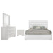 Upgrade your bedroom with this ultra-modern platform bed and matching case pieces. The bed features a sleek white faux leather upholstery with horizontal channel tufting, while its low-profile design enhances the contemporary aesthetic. Case pieces are finished in a polished white high-gloss polyurethane for a clean, sophisticated look. Polished chrome metal bar handles provide a sleek contrast, while spacious drawers with felt-lined top sections offer both style and functionality.