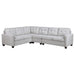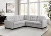 Ensure stylish seating for the whole family with a modern L-shaped sectional sofa. In beige for a warm, neutral presence, the sofa boasts tufted cushions and accent pillows that crate depth and dimension in an inviting living room. Back cushions are reversible for added versatility, while seat cushions are attached to ensure they stay in place when lounging or entertaining. Track arms establish a structured, simple silhouette, perfect for a wide variety of spaces and surrounding decor. Block feet taper to add the perfect finishing touch.