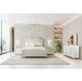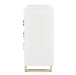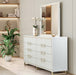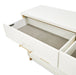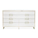 AICO Furniture Palm Gate Dresser in Cloud White N9086050SA-108. The Palm Gate Dresser, featuring Japan gold accents, eight spacious drawers, and stylish double handles, combines practicality with grandeur, creating a striking aesthetic.