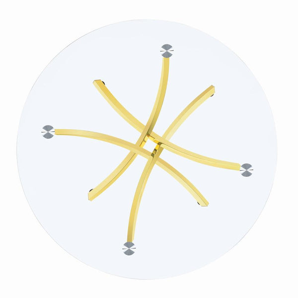This round dining table offers a striking balance of clarity and form. A clear tempered glass top creates an airy presence, while the sculptural asterisk-style base adds dramatic visual interest. Crafted from heavy gauge metal, the base is electroplated in a reflective brass or chrome finish, providing a luxurious touch to its contemporary silhouette. A bold yet functional centerpiece for modern dining spaces.
