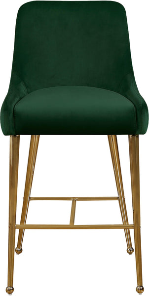 The home bar or kitchen counter gets a contemporary makeover with the addition of this Owen Green Velvet Stool. Clean lines and a simple design make this stool nothing short of elegant. The green velvet upholstery is sleek and svelte to the touch, revving up the comfort factor of this stunning stool. The polished gold legs have a ball design that's both modern and sophisticated, while a matching handle on the back adds to the overall modish feel of this delightful stool.