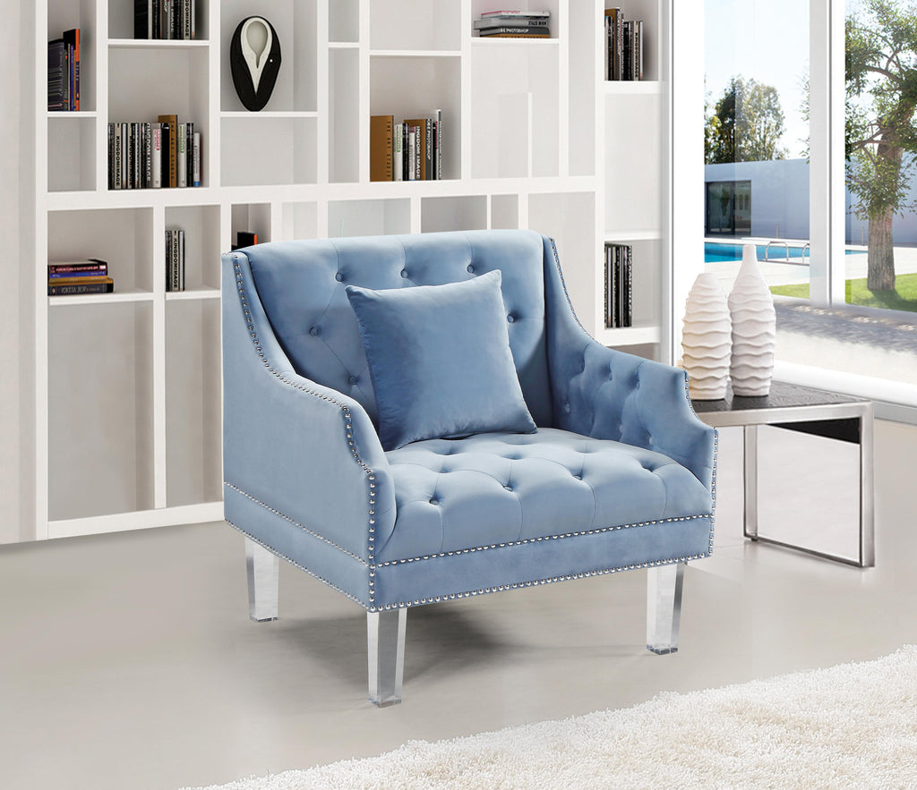 Bring a posh look home with this Roxy Sky Blue Velvet Chair. The velvet is both striking yet unobtrusive, giving your room an elegant style boost while providing you with a comfortable spot to sit and relax while reading or watching TV. Deep button tufting gives the chair a touch of texture while ensuring its sophistication is lost on no one. Add this contemporary chair on its own to your living room or den, or buy it alongside the coordinating sofa and loveseat for a complete and total makeover.