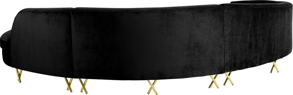 Relax in regal comfort with this stunning black velvet Serpentine three-piece sectional sofa. Plush black velvet upholstery provides a soft, cozy place for you to rest after a long day, and gold steel legs add just the barest touch of color to the sectional's chic design. Its lengthy design offers ample room for you to kick back and relax, either on your own after a long, hard day, or with your loved ones during family movie night.