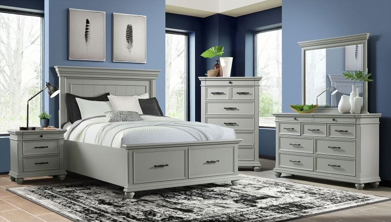 Bed (Headboard, Footboard, Rails), Dresser, Mirror, Nightstand