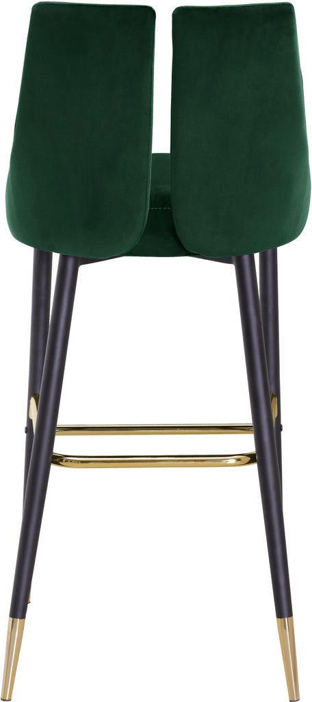 Define your home bar or kitchen counter in style with this Sleek Bar Stool from Meridian Furniture. It features a bar height design for easy integration with your existing setup, and it���s upholstered in soft green velvet material for a luxe look. The contemporary design makes this stool well at home in modern spaces, and the matte black metal legs with gold tips add to its modish appearance in your room.