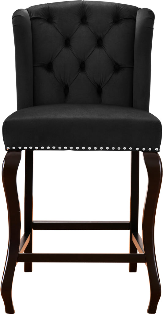 Rest easy on this Suri Black Velvet Stool, which blends modern design with timeless design elements for a look that wows. This handsome stool has a softly padded seat and back to ensure your absolute comfort while you dine at the kitchen counter or relax with a cocktail at the home bar. The plush black velvet upholstery is soft to the touch and sleek against your skin, and the turned legs and wooden frame add a chic traditional vibe to your room.