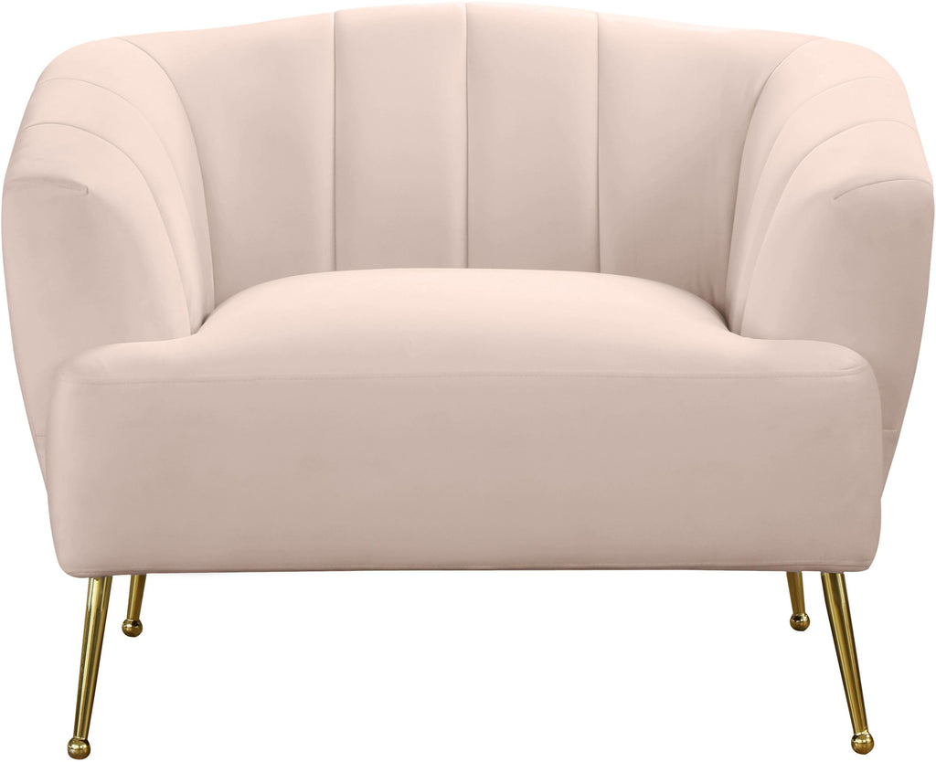 Dress up your living room space with this Tori Velvet Chair. This plush chair features fun pink velvet upholstery that covers every square inch, adding a sumptuous and svelte look to your room. The gold legs with a ball design on the foot adds to the elegant look of this pretty chair, and deep channel tufting adds loft to the back and arms for a lavish feel when you sit down to relax and unwind at day���s end.