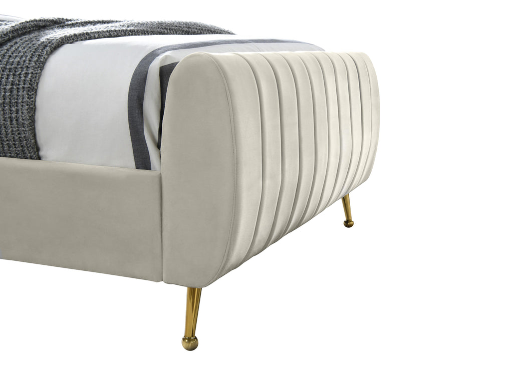 Slip into the lap of luxury with this Zara Velvet Bed. This beautiful king bed is padded to the max on its headboard and footboard for a look that is nothing short of upscale. The luxe design is amplified by the bed���s rich cream velvet upholstery and its deep detailed channel tufting, which also serves to keep the interior padding aloft, full, and comfortable while you relax or unwind in bed. The bed has gold legs for a regal touch, and it comes with slats, so it doesn���t require a box spring.